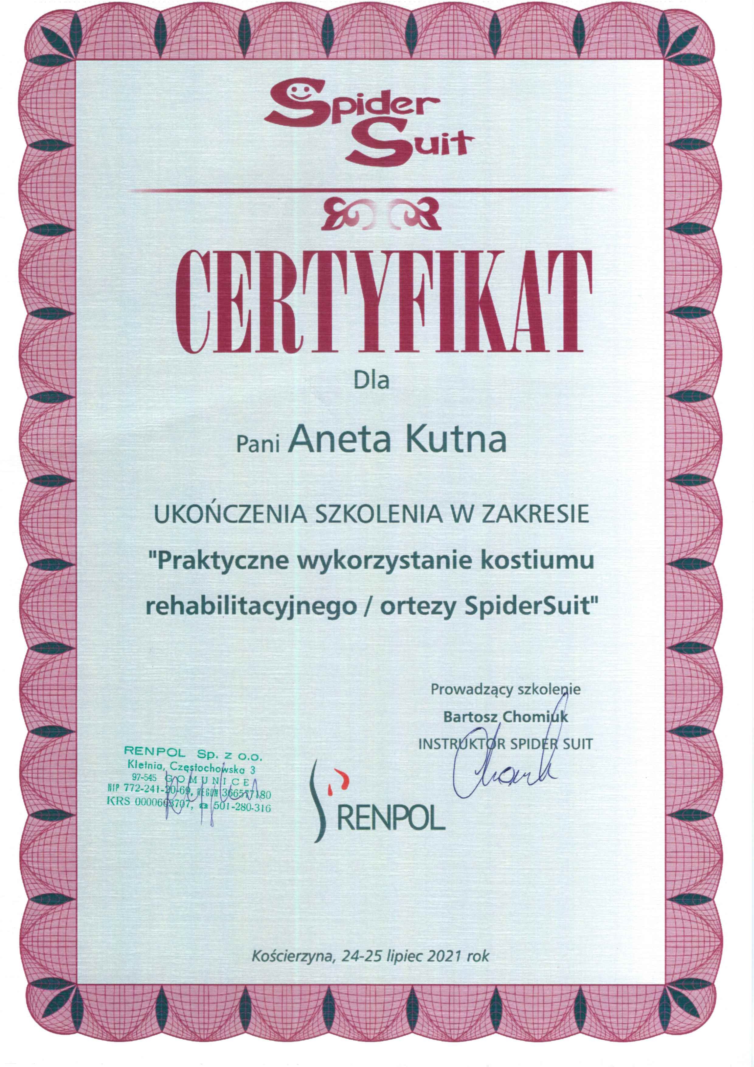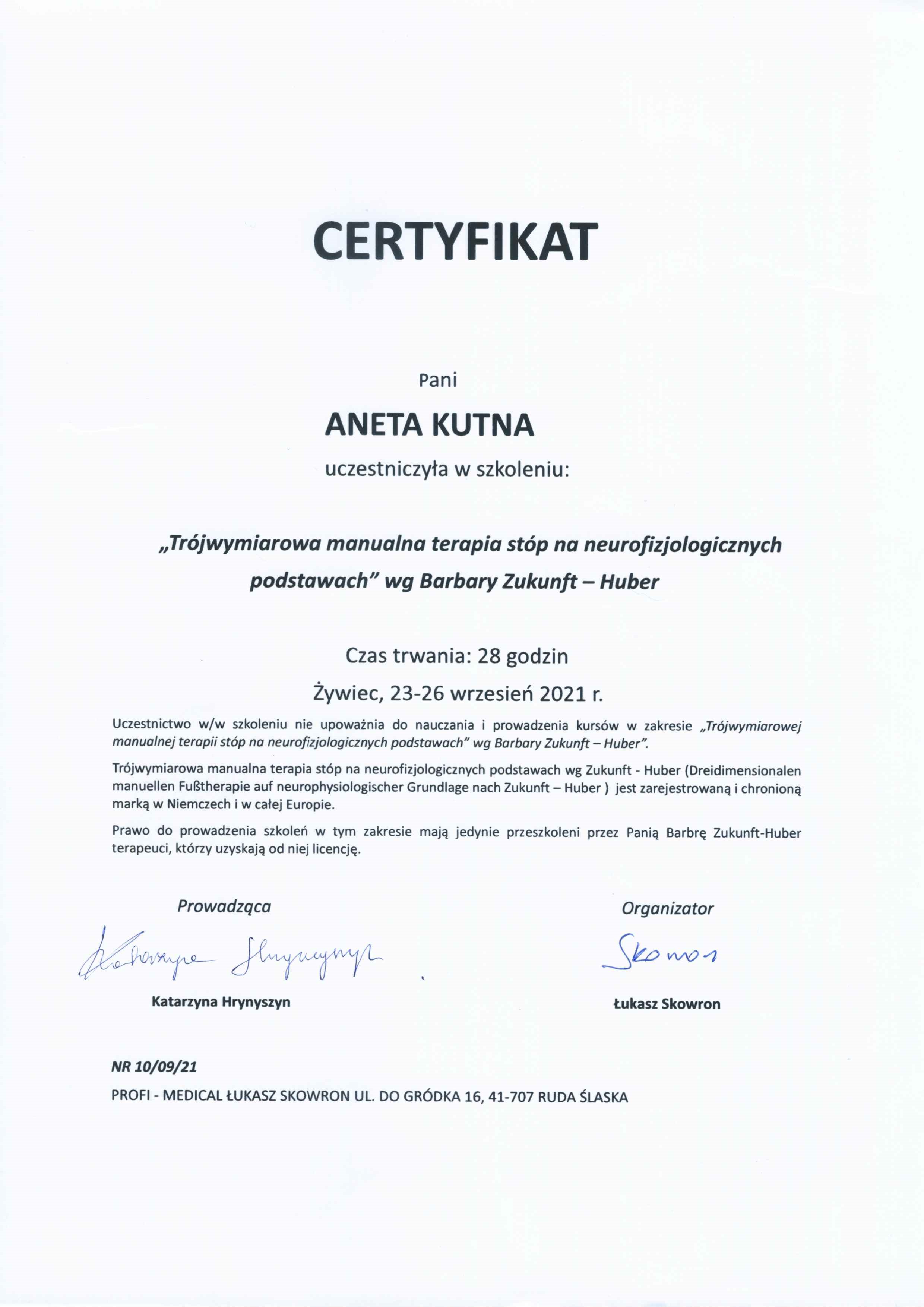 Mgr Aneta Kutna - Absolwentka fizjoterapii Wyższej Szkoły Administracji w Bielsku Białej (tytuł magistra). Posiada Prawo Wykonywania Zawodu Fizjoterapeuty o numerze: 19954.