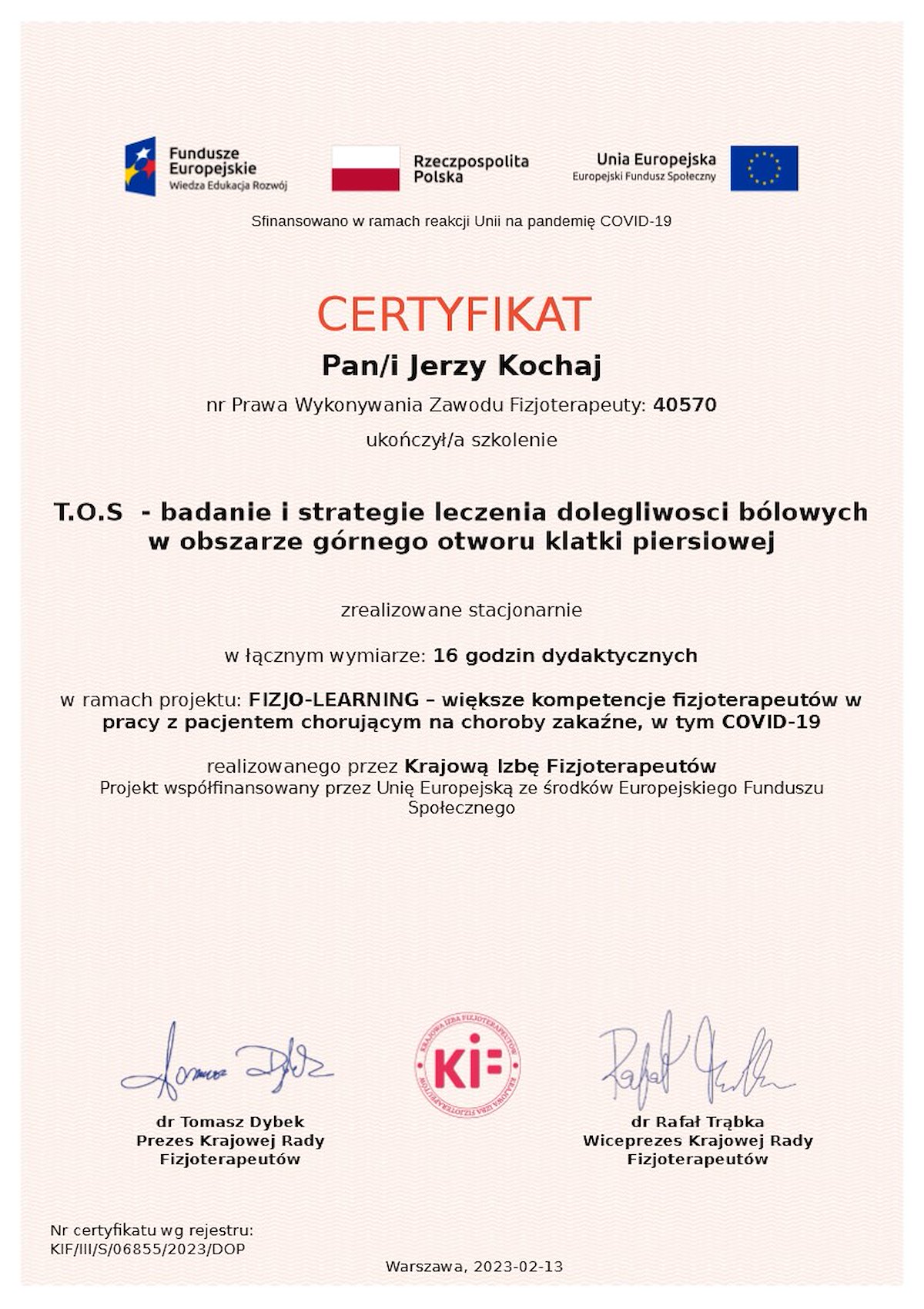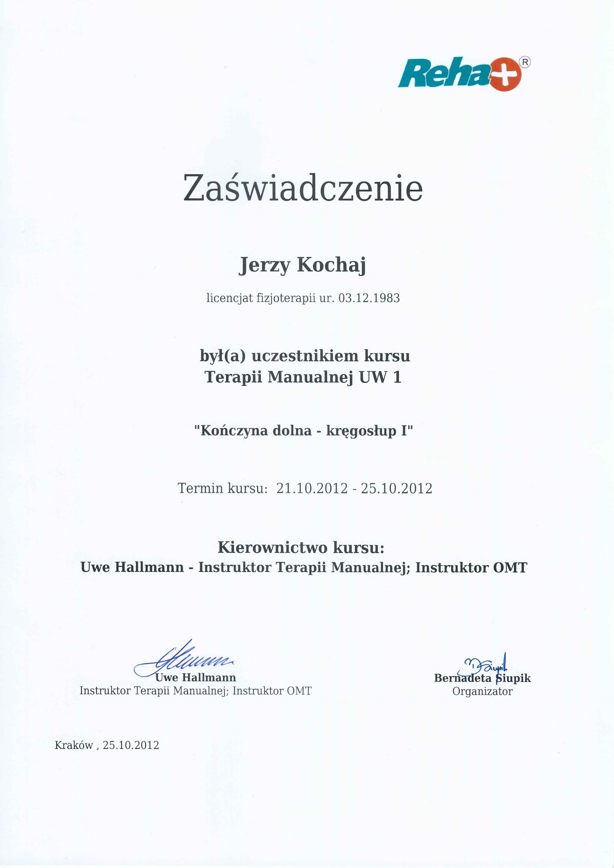 Mgr Jerzy Kochaj - Absolwent fizjoterapii Wydziału Wychowania Fizycznego i Fizjoterapii Politechniki Opolskiej - studia magisterskie. Absolwent wychowania fizycznego ze specjalnością odnowa biologiczna na Wydziale Wychowania Fizycznego i Fizjoterapii Politechniki Opolskiej- studia magisterskie.