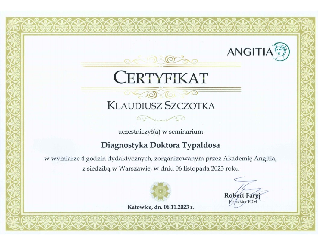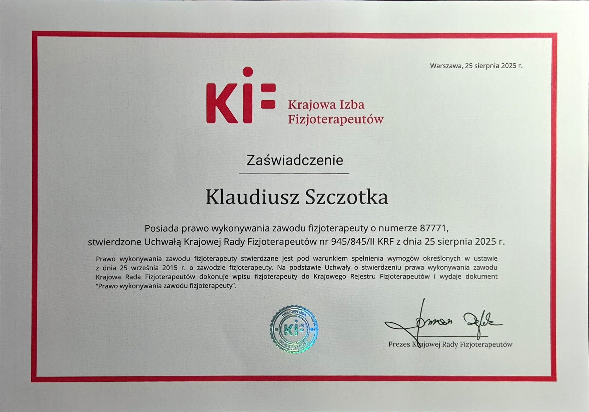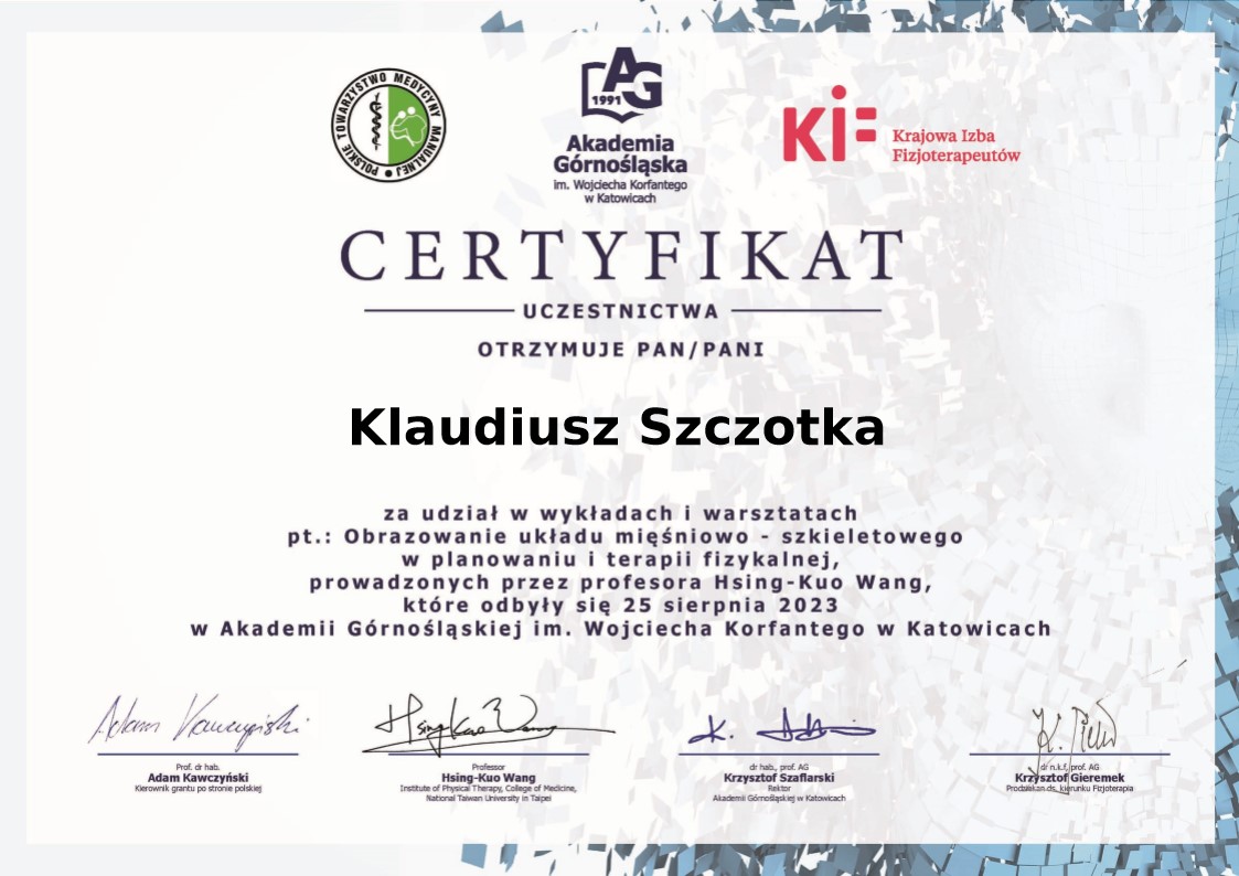Klaudiusz Szczotka - Absolwent fizjoterapii Śląskiego Uniwersytetu Medycznego w Katowicach (tytuł magistra). Posiada Prawo Wykonywania Zawodu Fizjoterapeuty o numerze: 87771.