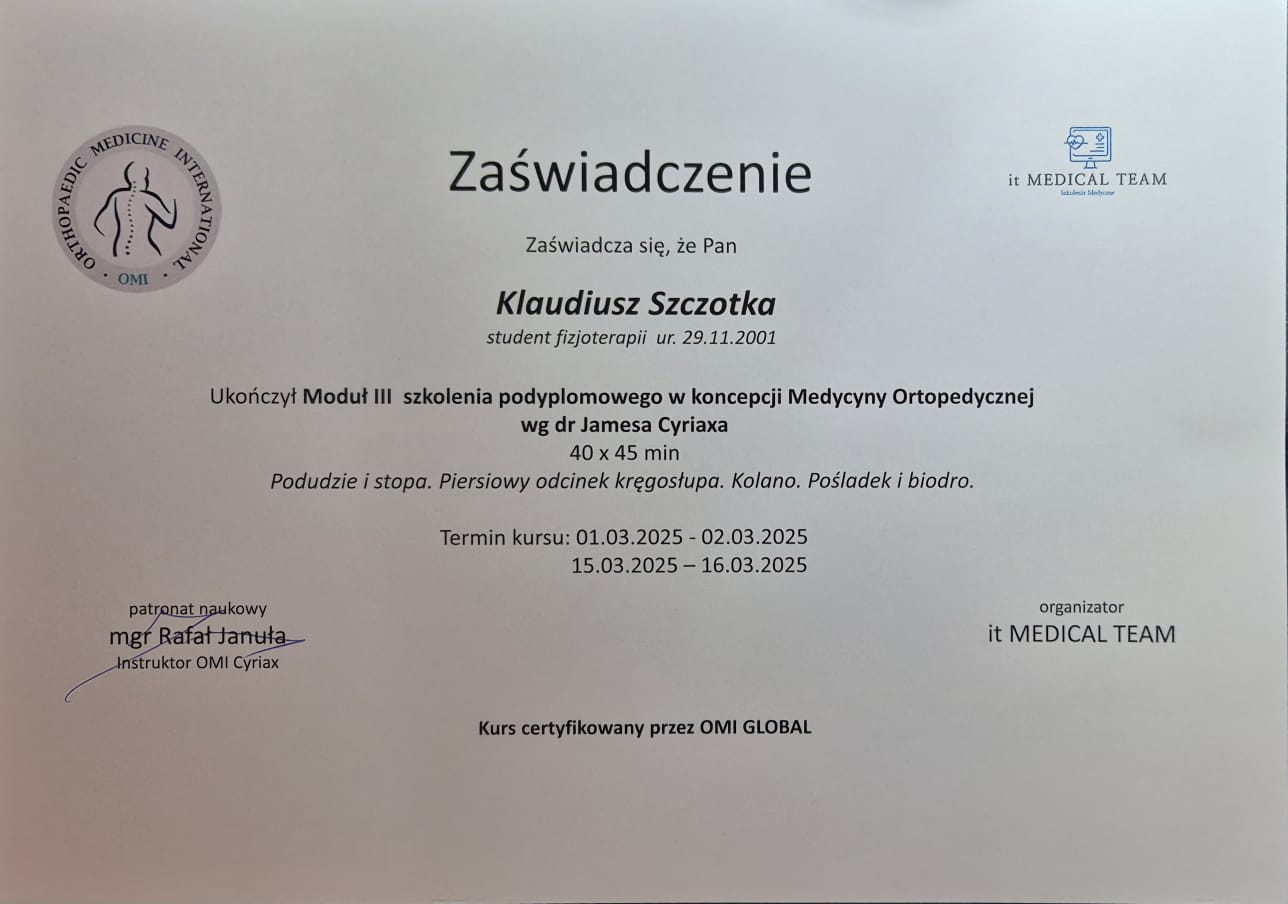 • Medycyna Ortopedyczna wg Cyriax'a: „staw skokowy, odcinek piersiowy kręgosłupa, staw biodrowy, staw kolanowy” moduł III
