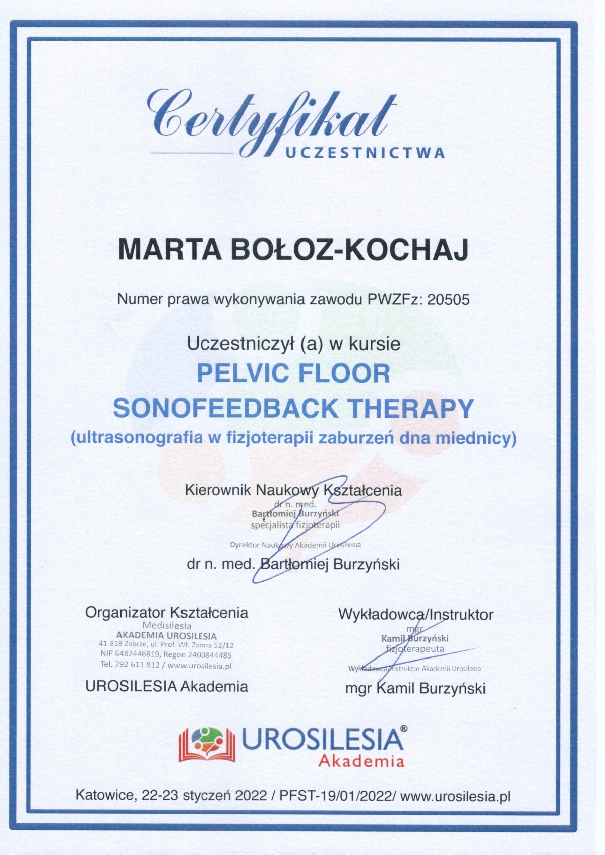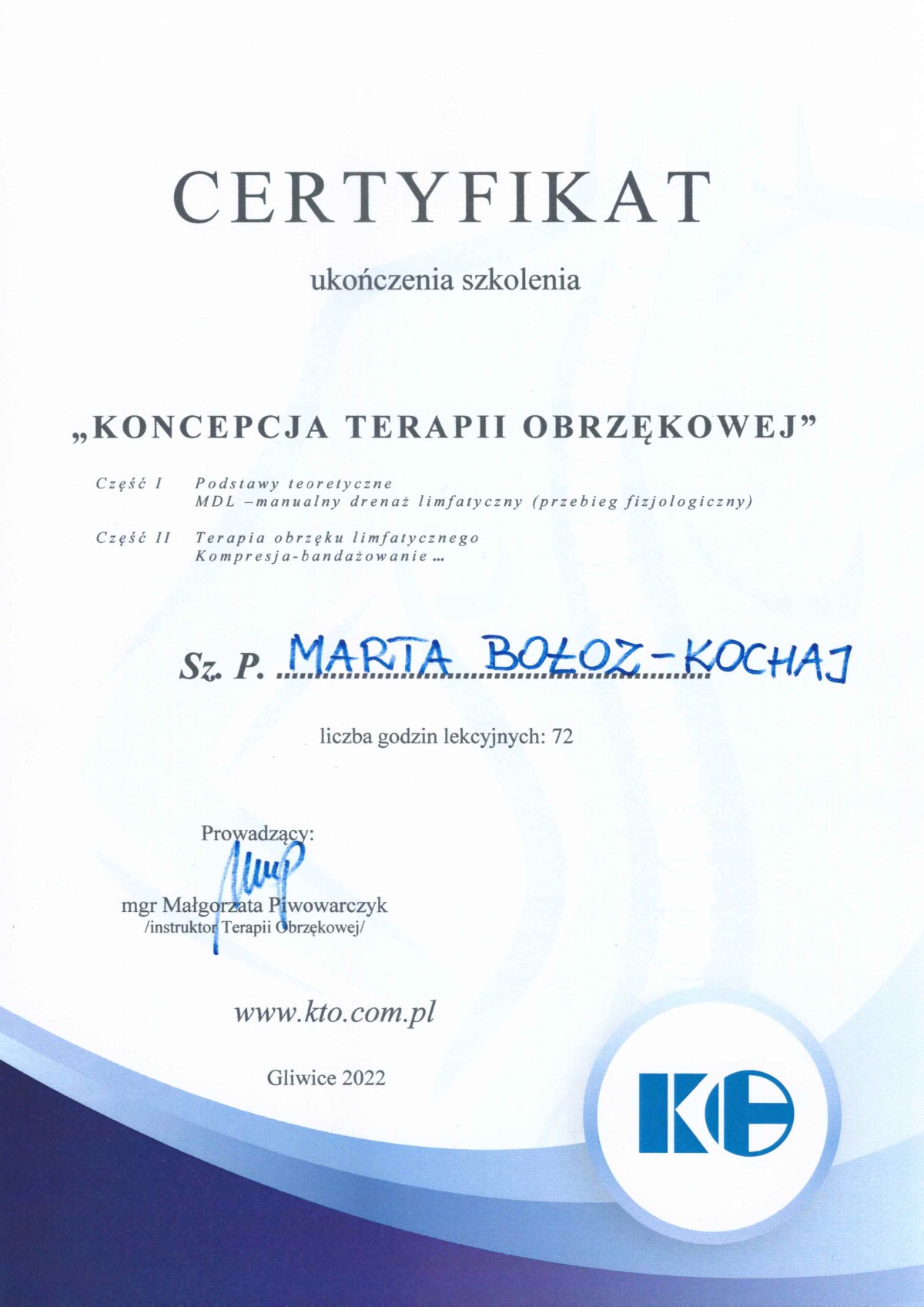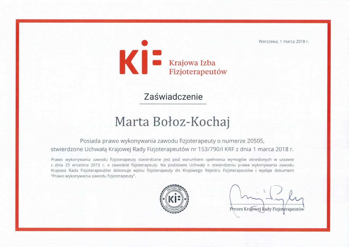 Mgr Marta Bołoz-Kochaj - Absolwentka fizjoterapii Śląskiego Uniwersytetu Medycznego w Katowicach (tytuł magistra). Posiada Prawo Wykonywania Zawodu Fizjoterapeuty o numerze: 20505.