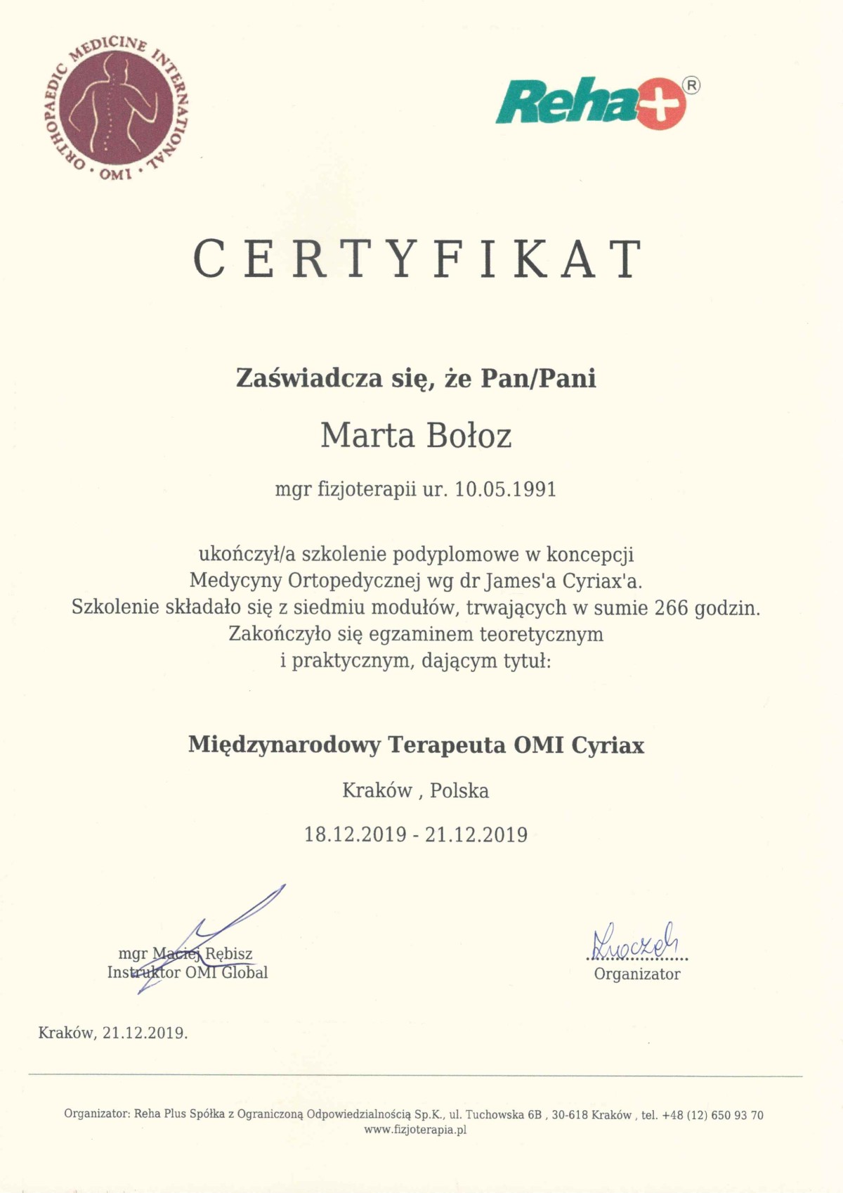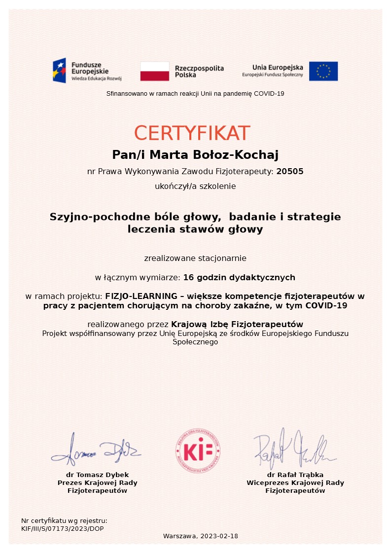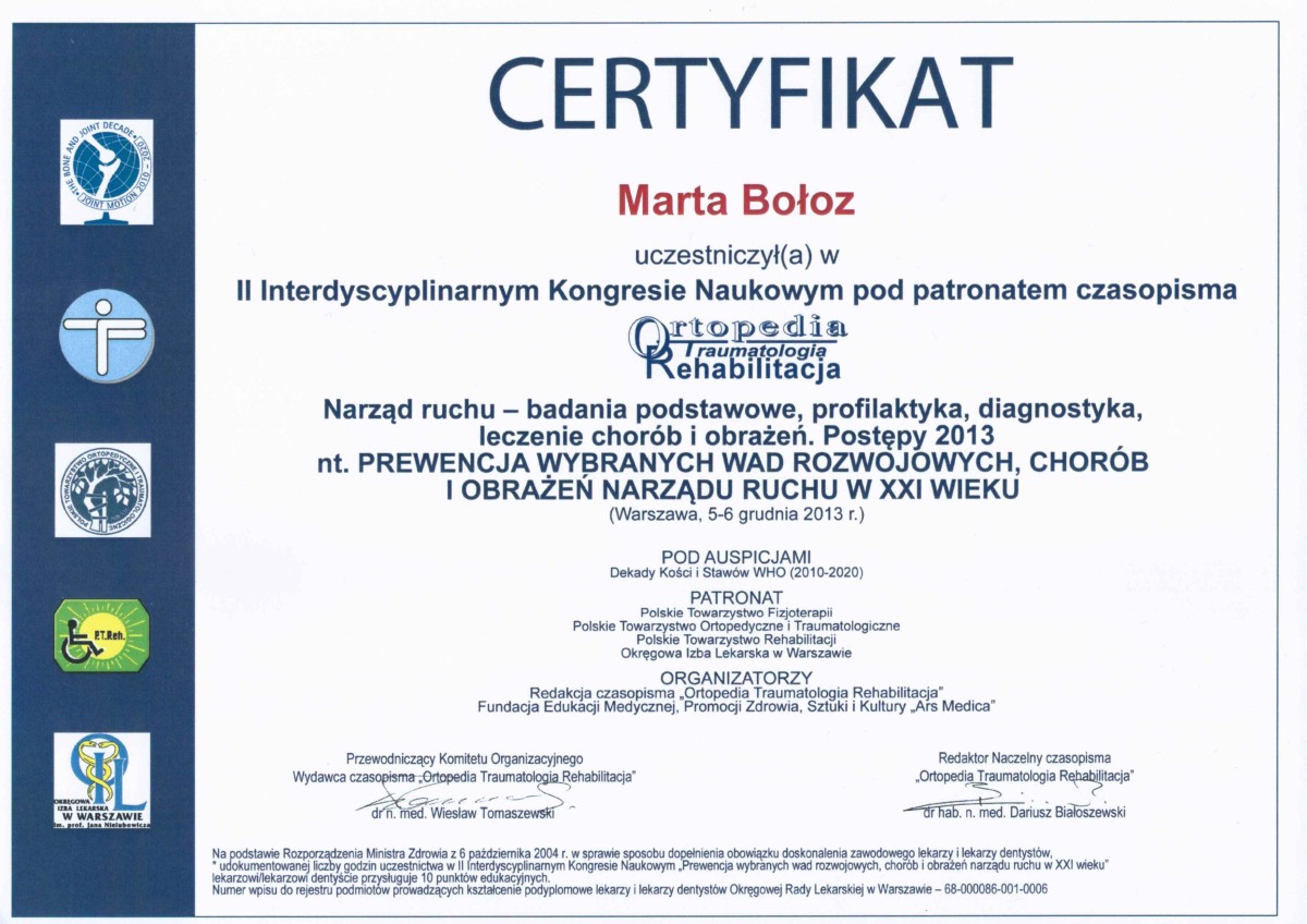 Mgr Marta Bołoz-Kochaj - Absolwentka fizjoterapii Śląskiego Uniwersytetu Medycznego w Katowicach (tytuł magistra). Posiada Prawo Wykonywania Zawodu Fizjoterapeuty o numerze: 20505.