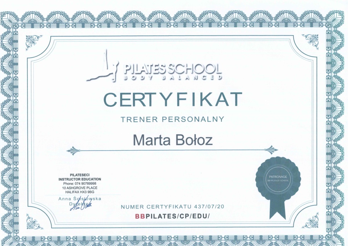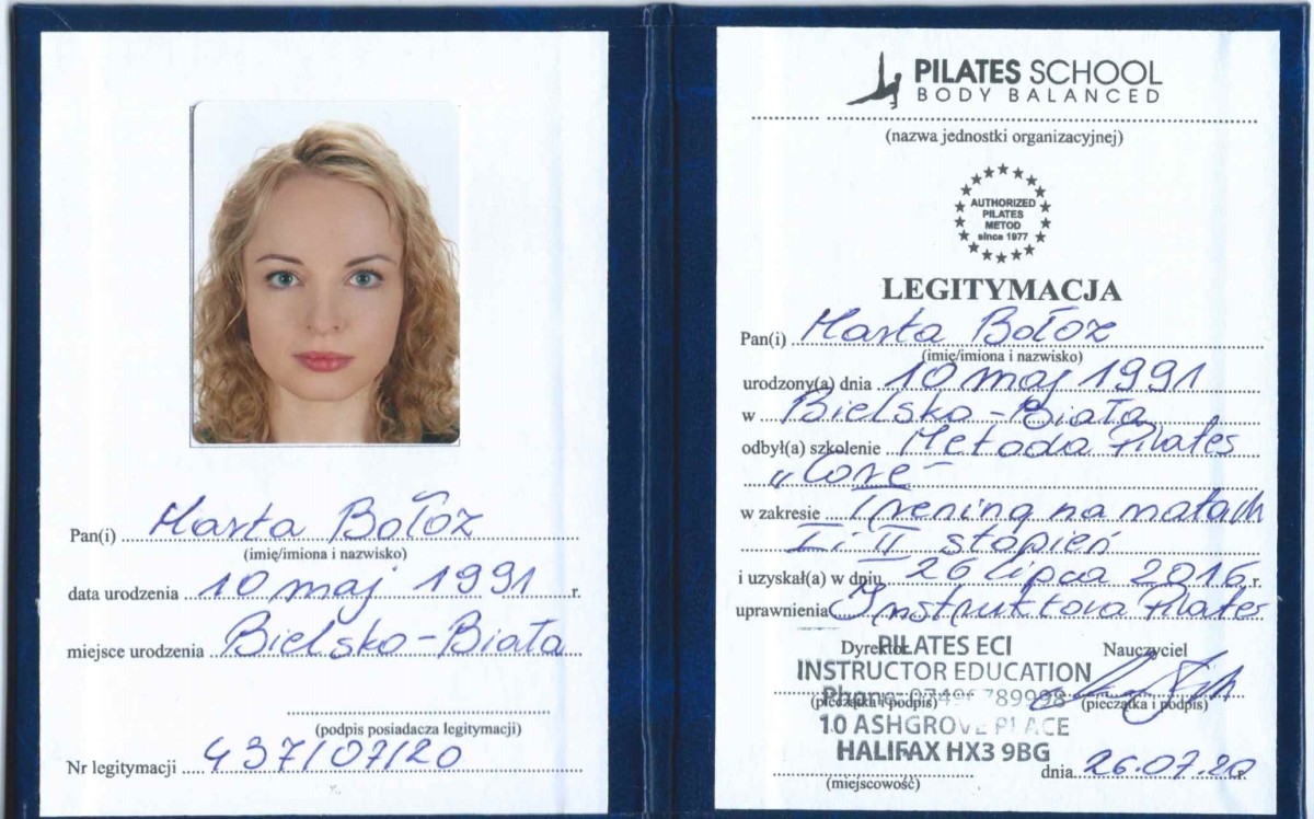 - Instruktor Pilates, specjalizacja core w grupach zwiększonego ryzyka (zdrowy kręgosłup, ćwiczenia po porodzie, senior), trening na matach I, II stopień