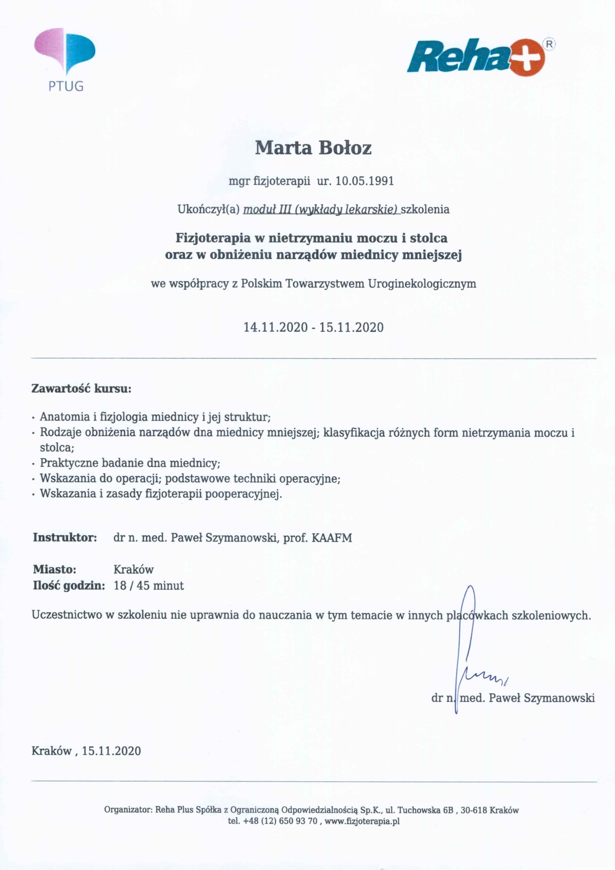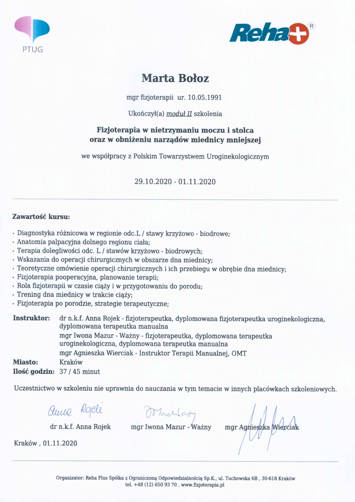 - „Fizjoterapia w nietrzymaniu moczu i stolca oraz w obniżeniu narządów miednicy mniejszej” PTUG moduł IV, V (kurs zakończony egzaminem dającym tytuł Dyplomowanej Terapeutki Uroginekologicznej)