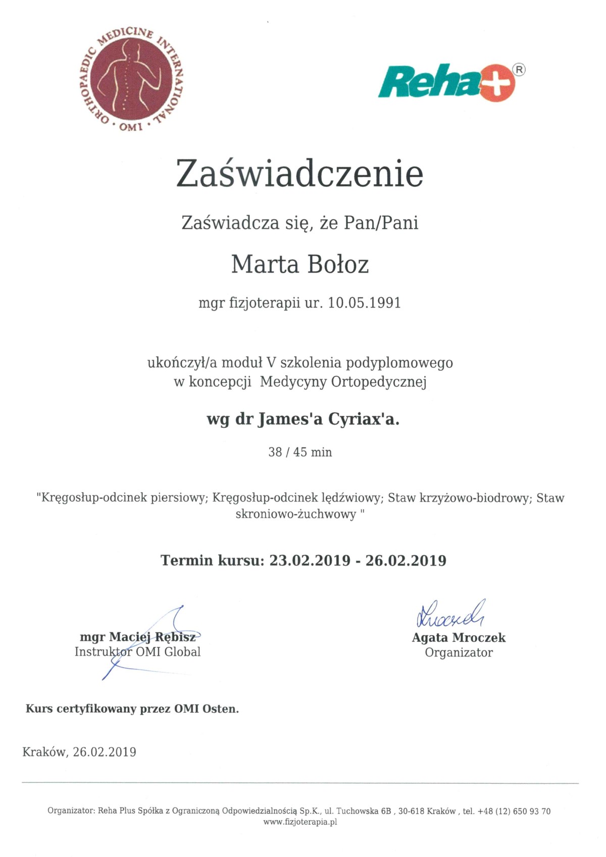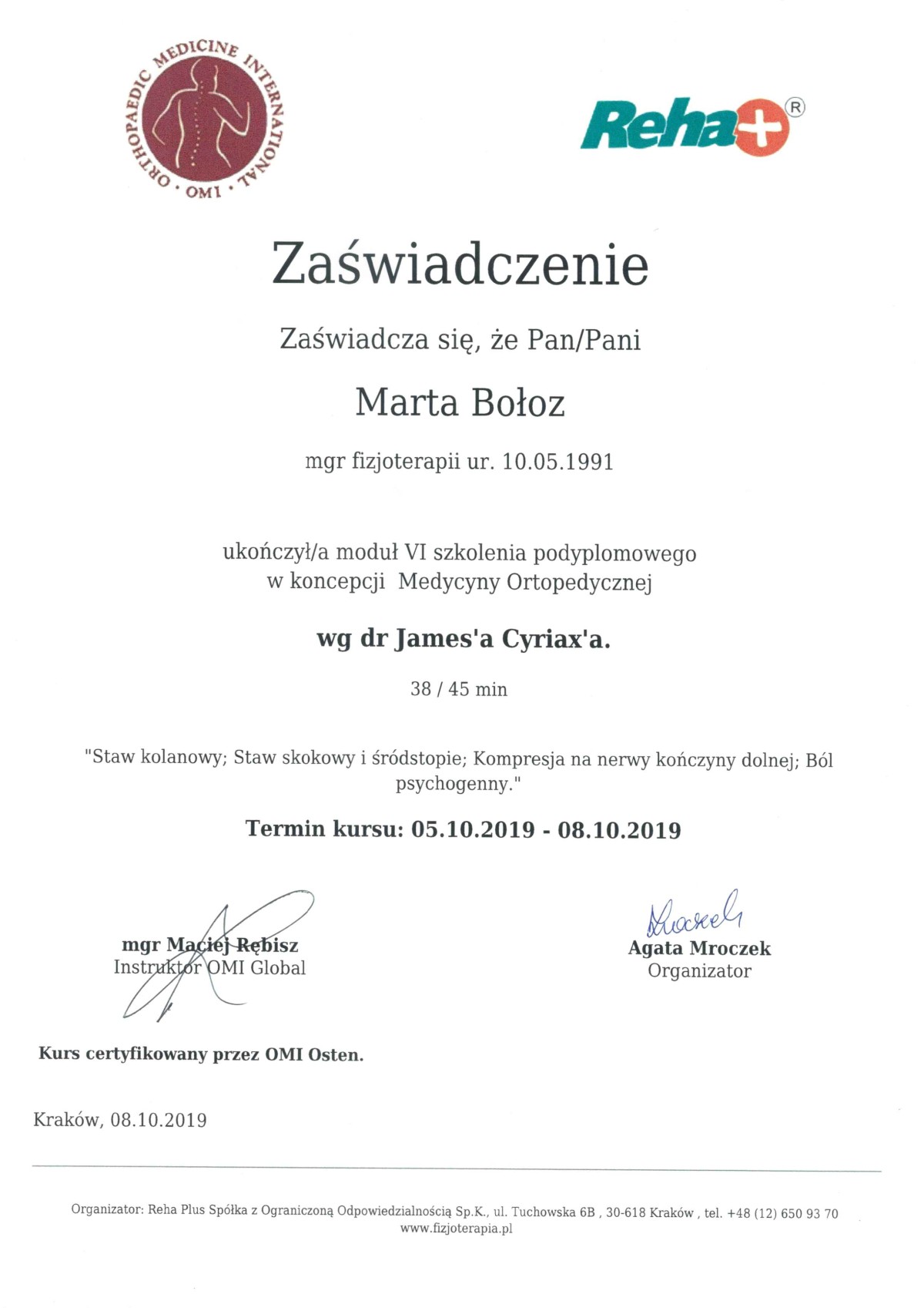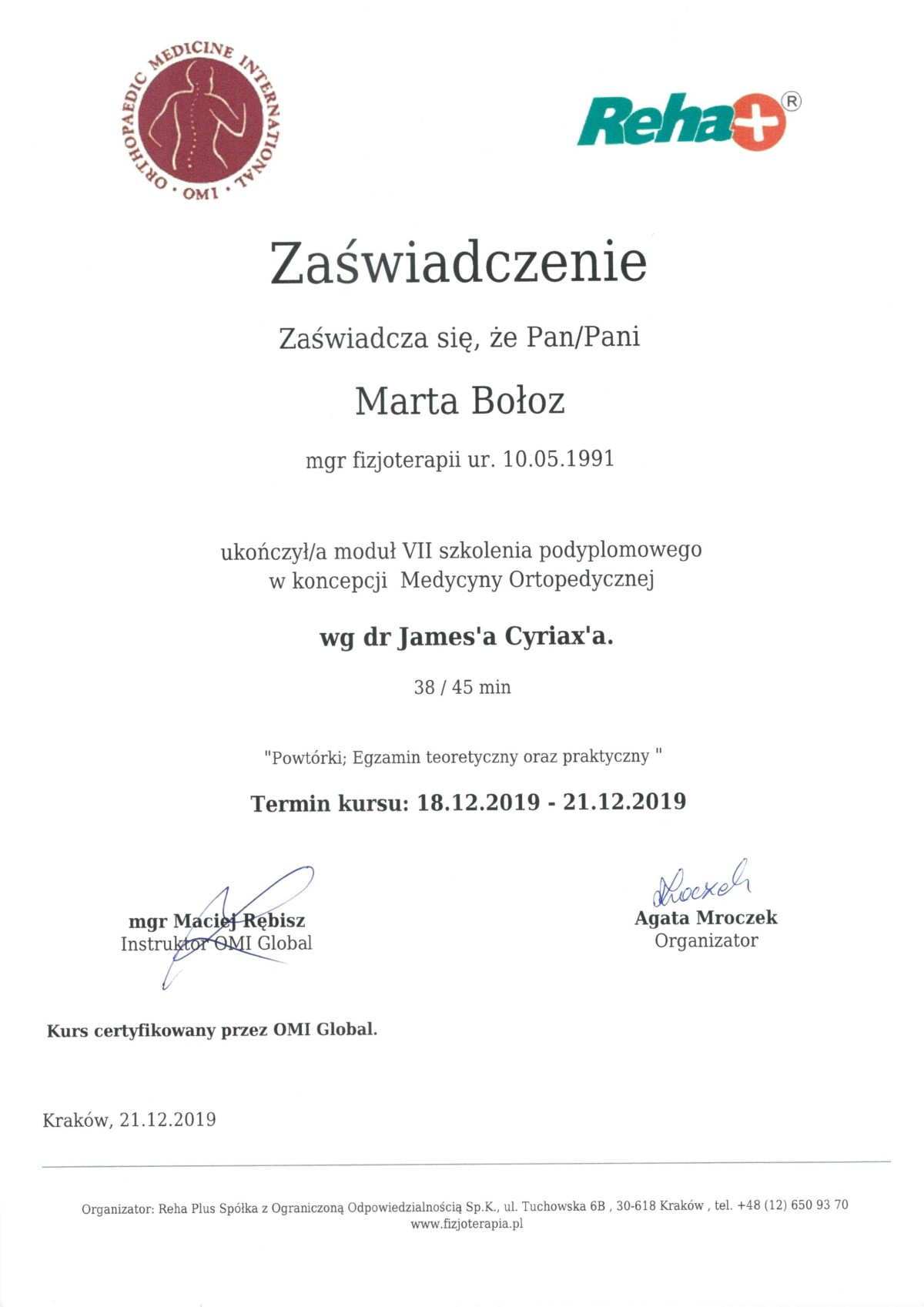 - Medycyna Ortopedyczna wg Cyriax'a: moduł VII -Egzamin (kurs zakończony egzaminem dającym tytuł Międzynarodowego Terapeuty OMI Cyriax)