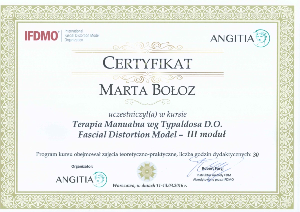 - Diagnostyka i leczenie zaburzeń powięziowych w oparciu o model odkształcenia powięzi - Fascial Distorsion Model “FDM“:„Terapia manualna wg Typaldosa D.O. moduł III