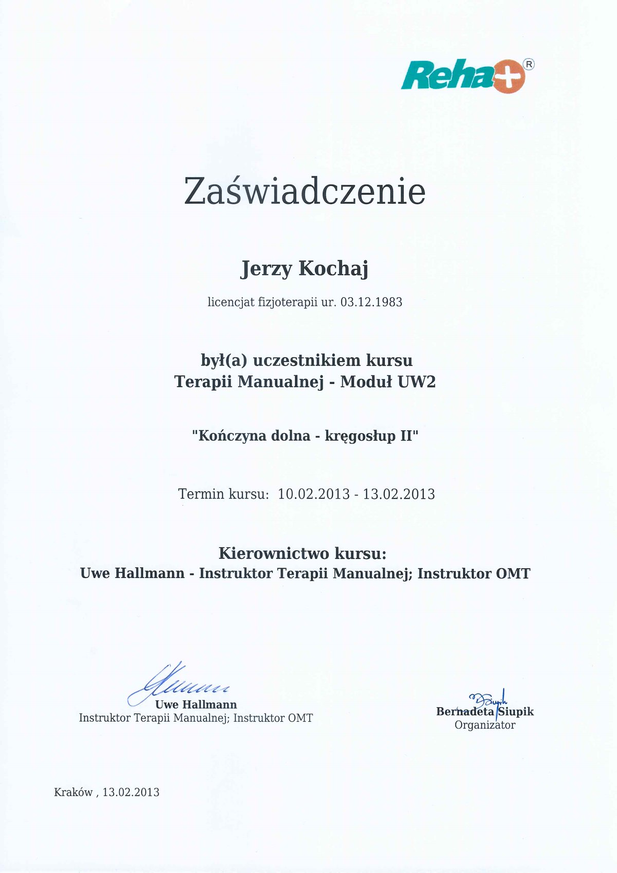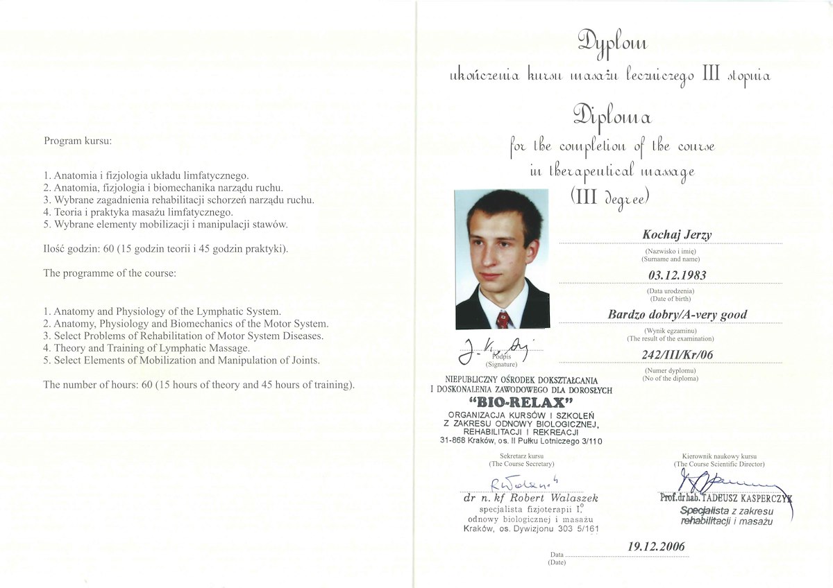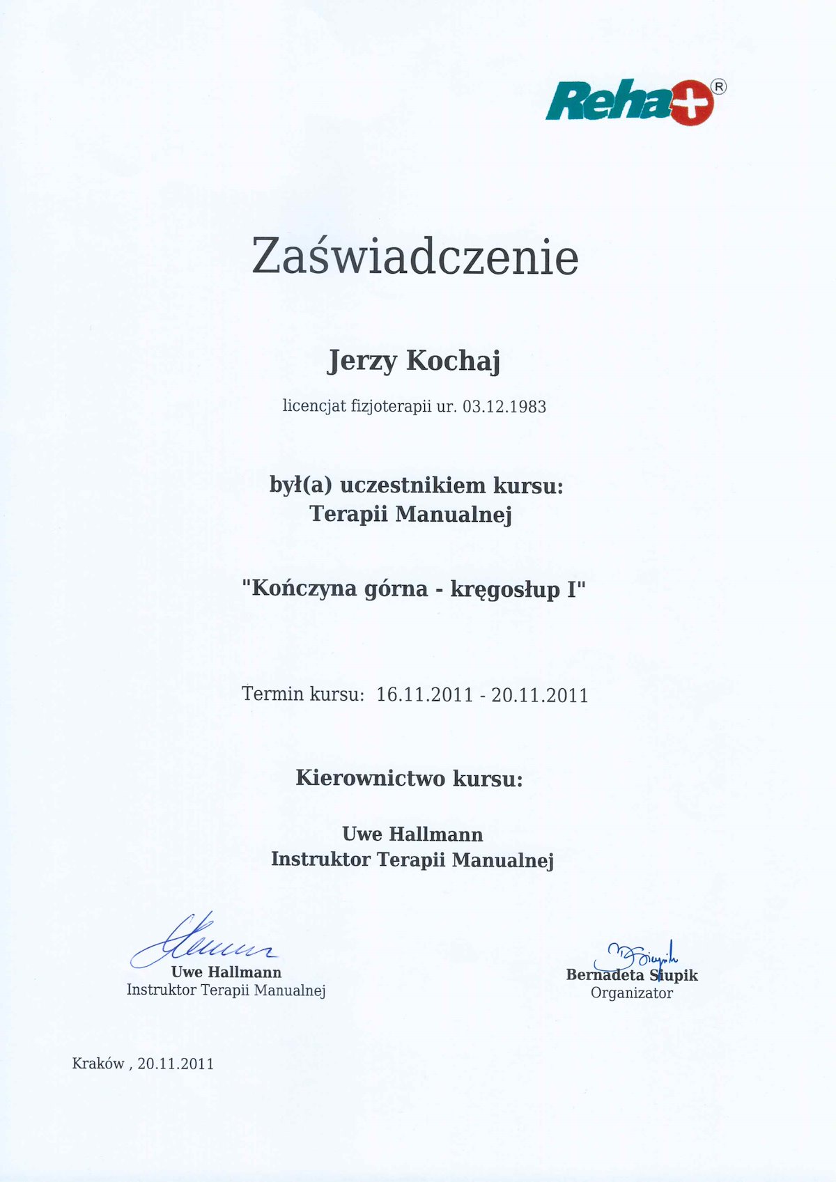 Mgr Jerzy Kochaj - Absolwent fizjoterapii Wydziału Wychowania Fizycznego i Fizjoterapii Politechniki Opolskiej - studia magisterskie. Absolwent wychowania fizycznego ze specjalnością odnowa biologiczna na Wydziale Wychowania Fizycznego i Fizjoterapii Politechniki Opolskiej- studia magisterskie.